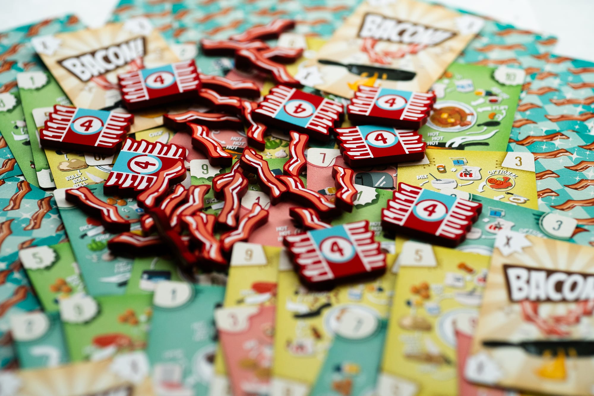 Bacon is a climbing game that thrives at one of those rare, difficult-to-hit player counts — six! At six players, you’ll form teams of three. The trick play in Bacon is easy to follow: You’re playing melds and trying to help your team go out first. You get more points the earlier your team goes out, too. As a team game at six, it’s tremendous. At four, it’s good. It’s also interesting played in a three-player game, but that does feel somewhat like a different game altogether. Designed by Sean Ross, illustrated by William Harris, and published by Allplay.