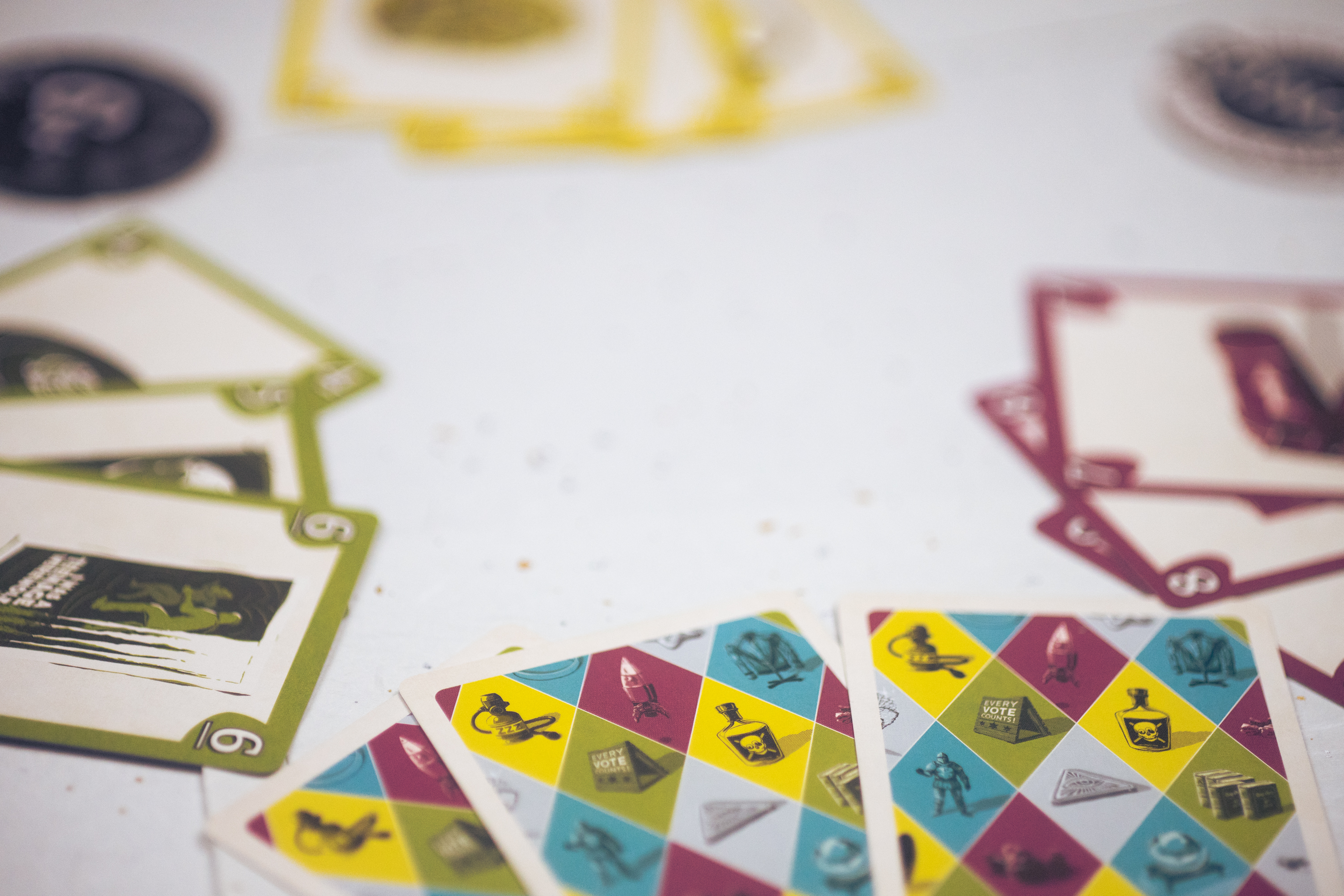 Odin is a climbing game in which you’re not playing traditional sets or runs, but you’re playing groups of cards that comprise a number higher than the last set played. You might play, say, the blue 7, 5, and 3 cards, but you could be beat by 7, 5, and 4 of another color, or 7, 7, and 7 of various colors. Each player that beats another set will take a card from the trick and add it to their hand. That last bit makes it a very interesting game, and you’ll have to carefully consider when you beat a trick. Designed by Yohan Goh, Hope S. Hwang and Gary Kim; illustrated by Crocotame; published by Helvetiq.