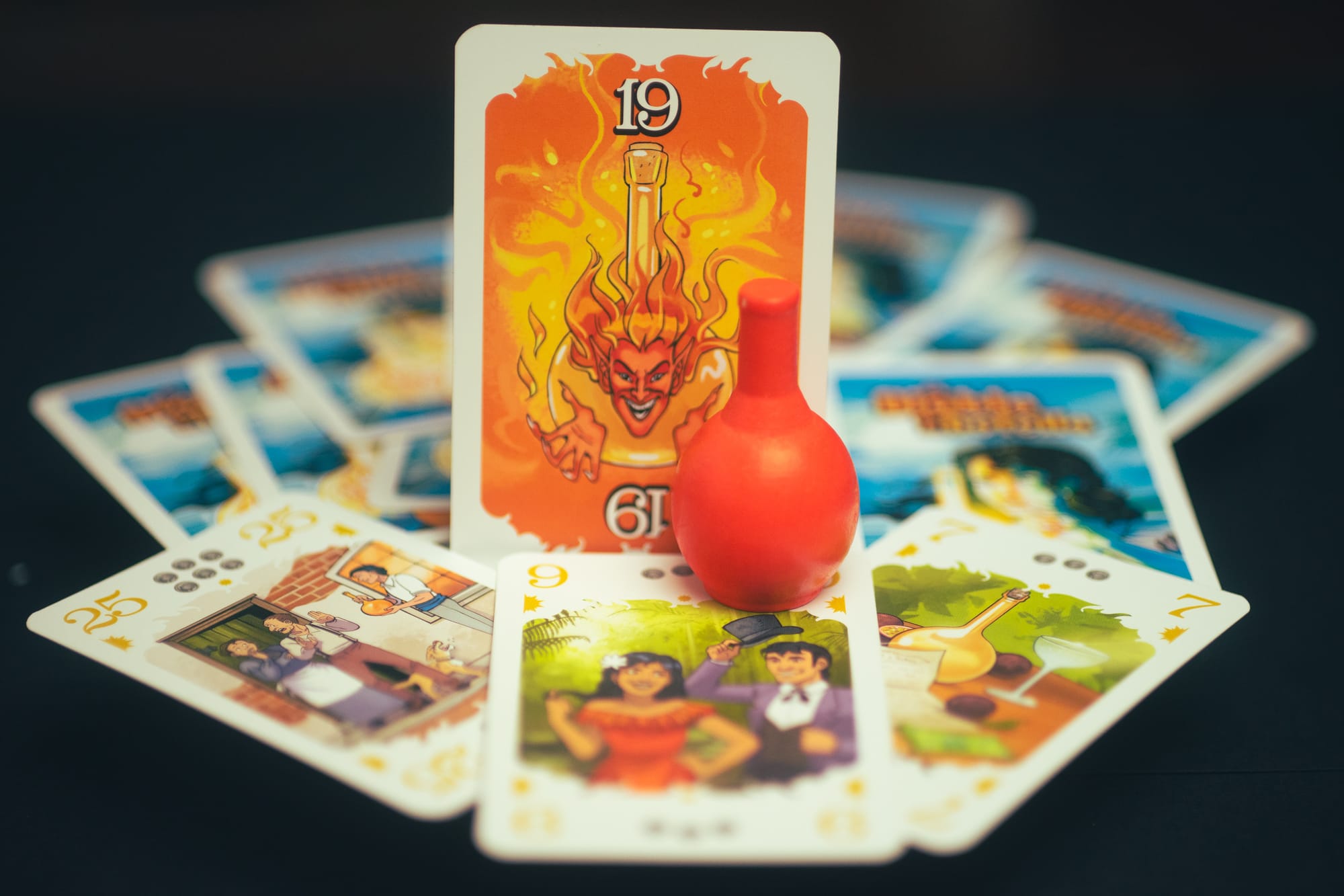 - The Bottle Imp (Cornett, 1995 and 2024) takes the classic Robert Louis Stevenson story and crafts a great trick-taking game around it. Basically, you’re trying not to be the last player stuck with the bottle, and you get the bottle by playing a card lower than the bottle’s active price. It’s not a perfect game, but it’s an important one, even if it the game has a knack for making you feel stuck in the mud sometimes. I think it’s an important part of a trick-taking education.