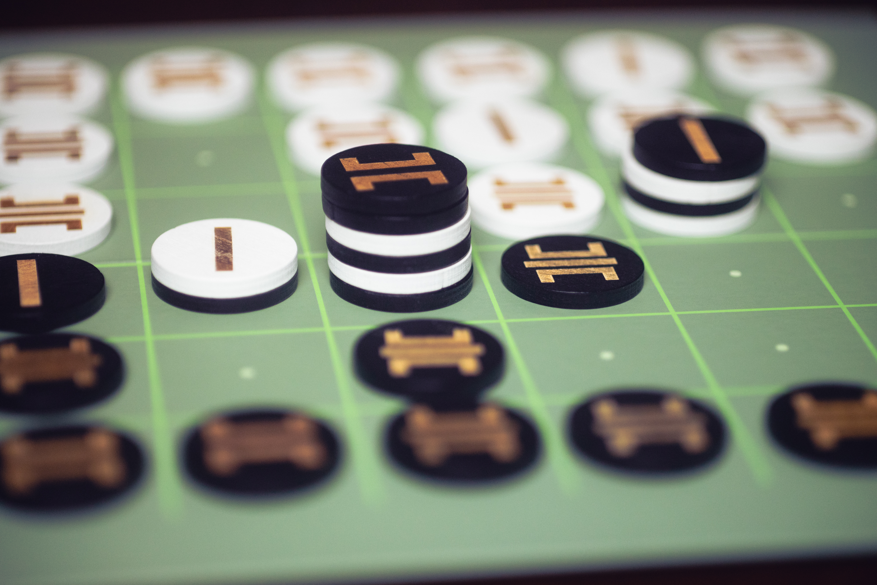 - Hokito (2020) — A true abstract strategy game in which you’re stacking your pieces on your opponent’s. Each piece moves either one, two or three spaces, based on what’s pictured on it, but it skips over empty spaces. Designed by Claude Leroy, published by Cosmoludo.