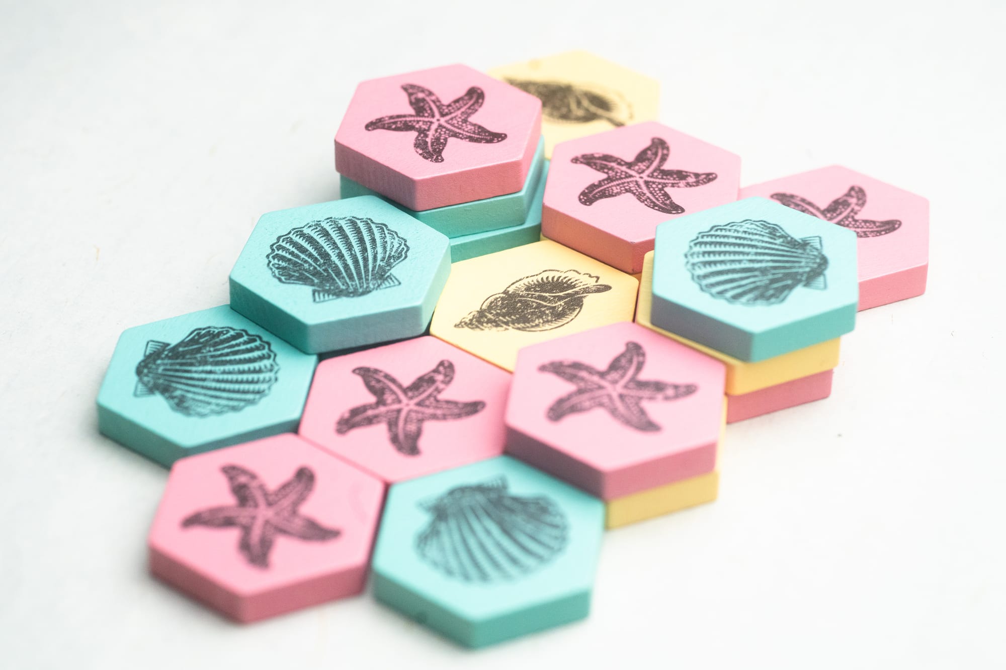 The first published game I saw from Marceline Leiman was High Tide (2024). She released it initially at the Indie Games Night Market at PAX Unplugged in 2024, having only a few unpublished titles to her name beforehand. High Tide was perhaps the biggest story to come from that particular event. It’s a quick two-player abstract strategy game wherein you’re trying to move hexagonal tiles of your color atop your opponent’s tiles, with the player with the most uncovered tiles coming away the winner. It’s such a smart little game.