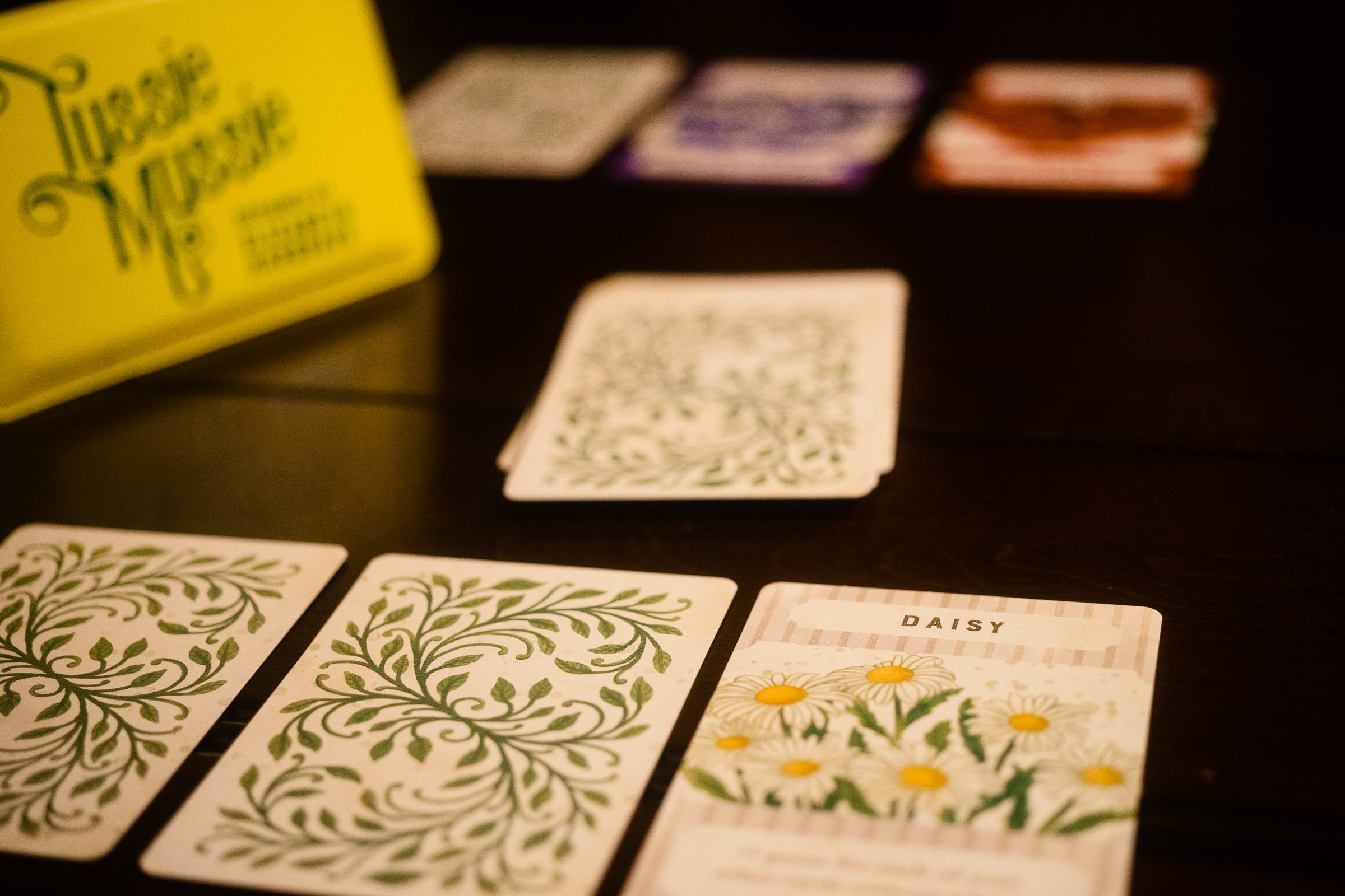 Encased in a small wallet, Tussie Mussie is a card-drafting game that plays in just about 15 minutes. You’ll offer one of two flower cards to their fellow players — one face-up, one face-down. You’ll then keep the one the player next to you didn’t take, adding it to your collection. Play well, and you might get your opponents to pick up cards that won’t help them earn points. Play poorly, and you might trap yourself in a helpless position. Elizabeth Hargrave really did a nice job with this game.