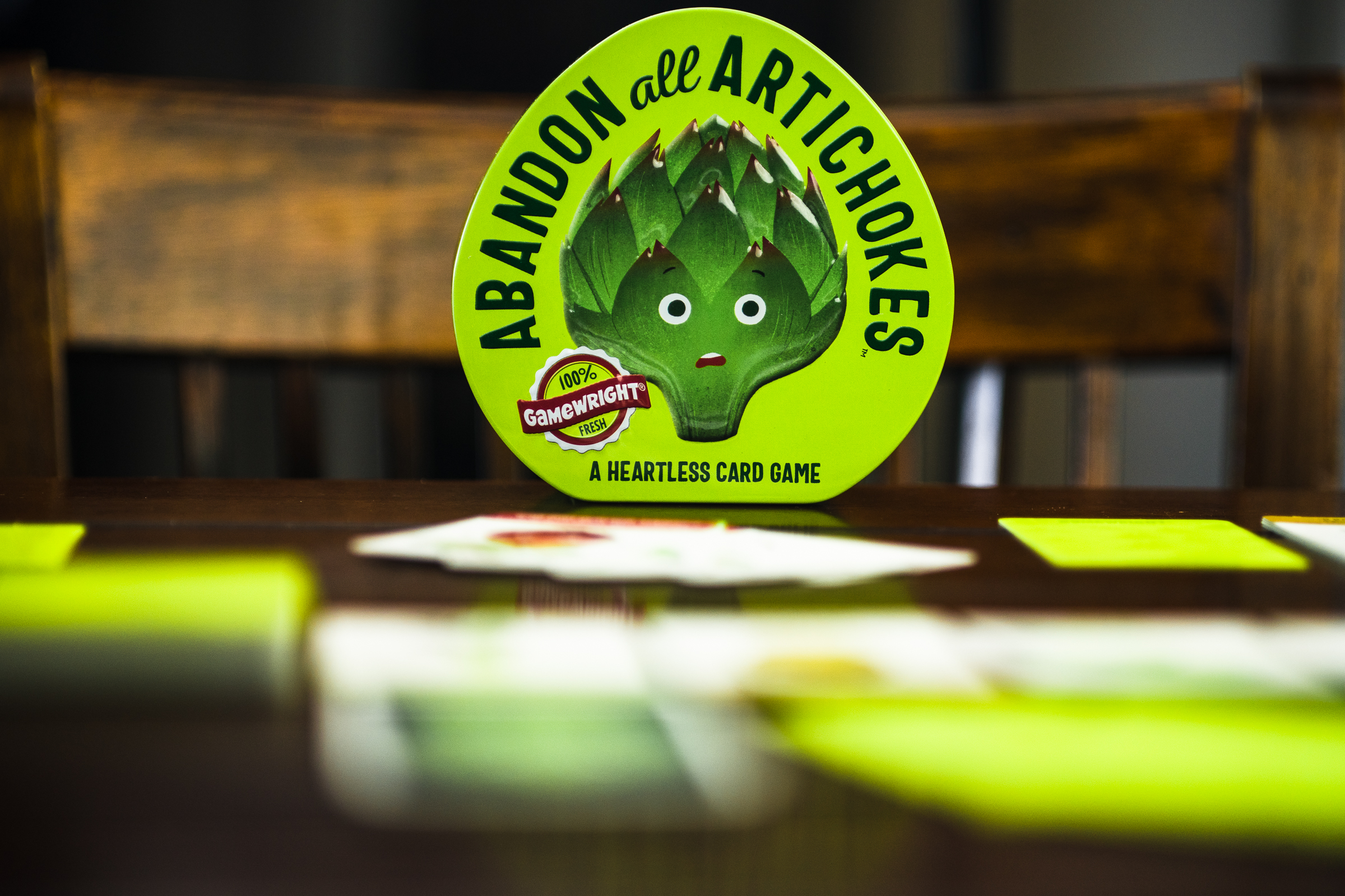 Emma Larkins is one of my favorite up-and-coming designers, and Abandon All Artichokes — a “deck-wrecker” — is a really fantastic lightweight card game. It’s very clever.