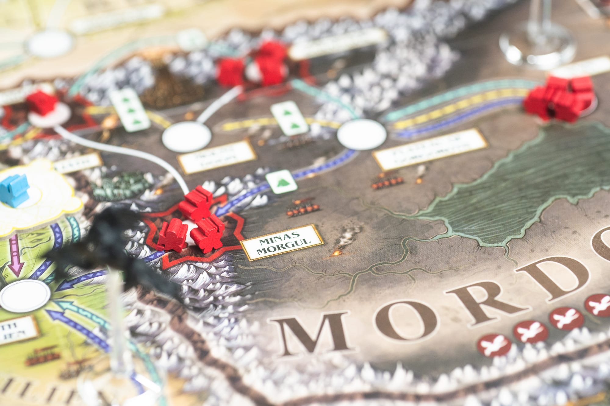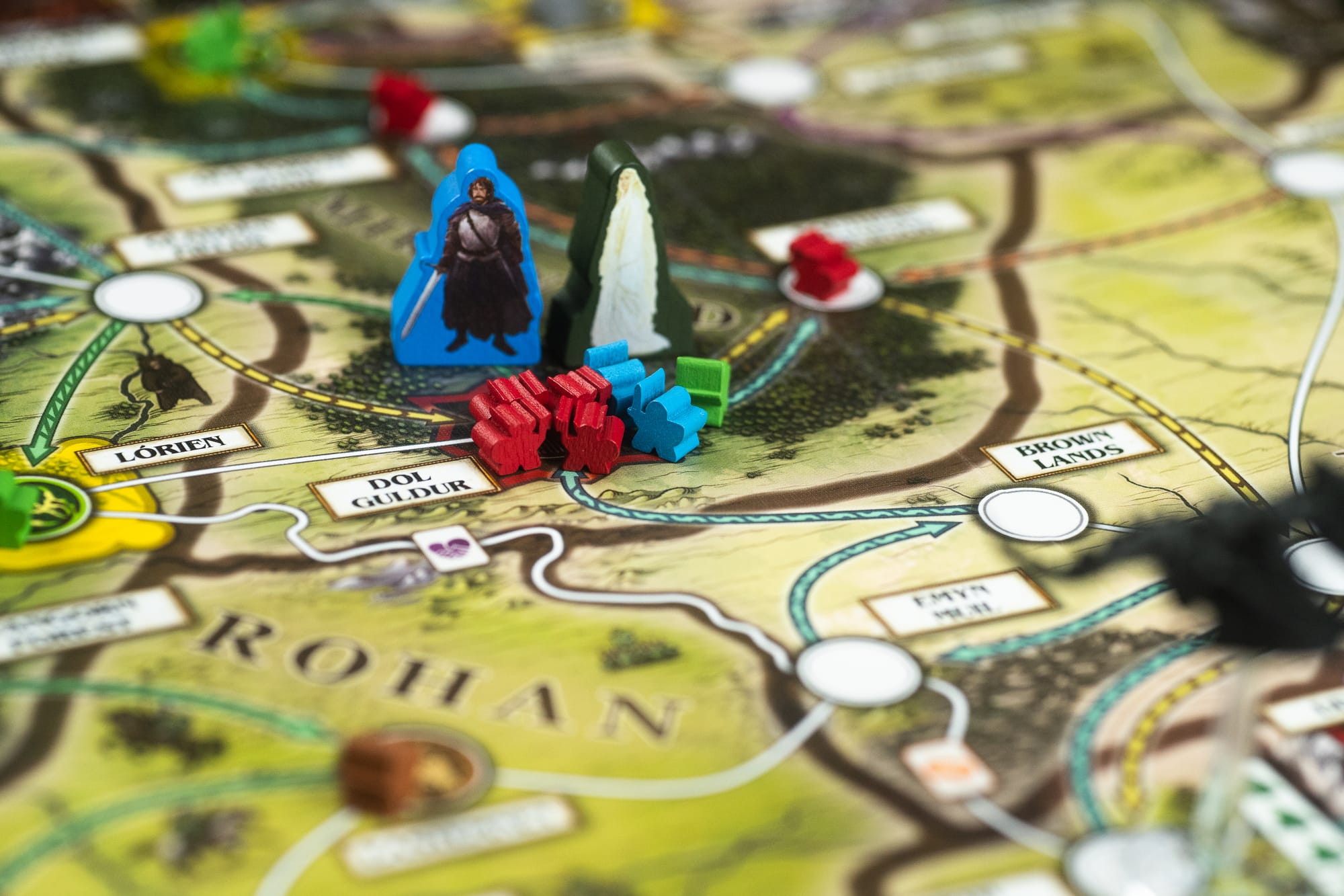 Havens have no clear analog in classic Pandemic, and they are not closely related to havens in the Pandemic Legacy series. In essence, a haven represents a stronghold for the Free Peoples (which is to say, Elves, Dwarves, and two types of troops of Men, the Rohirrim and armies of Gondor, though I know them better as green, grey, brown and blue, respectively) in the battle against Sauron and his armies. When you place those enemy armies (of which there is only one type and supply), they cannot be placed in havens. They can, however, be reconquered, causing the party to lose Hope. Ah — another piece of the puzzle, and another way this game differs in key ways from Pandemic.
