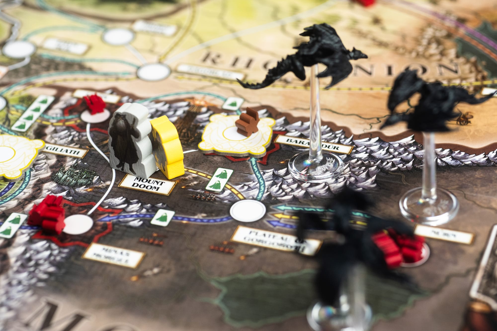 That fundamental conflict plays out every turn as you balance which character will take four actions with the character that will take one action. Early on, it allows you to navigate tricky waters, especially for the player controlling Frodo and Sam. See, Frodo and Sam are different than the other characters, in that there are Nazgûl and the eye of Sauron searching for the bearer of the ring. Every time Frodo moves, a search is performed, with a die rolled for each Nazgûl and shadow army. Those dice feature two ways hope is lost, which largely means that Frodo’s moving around either in safe regions or through the use of stealth. (You can also put on the ring, but that’ll result in lost hope, too.)