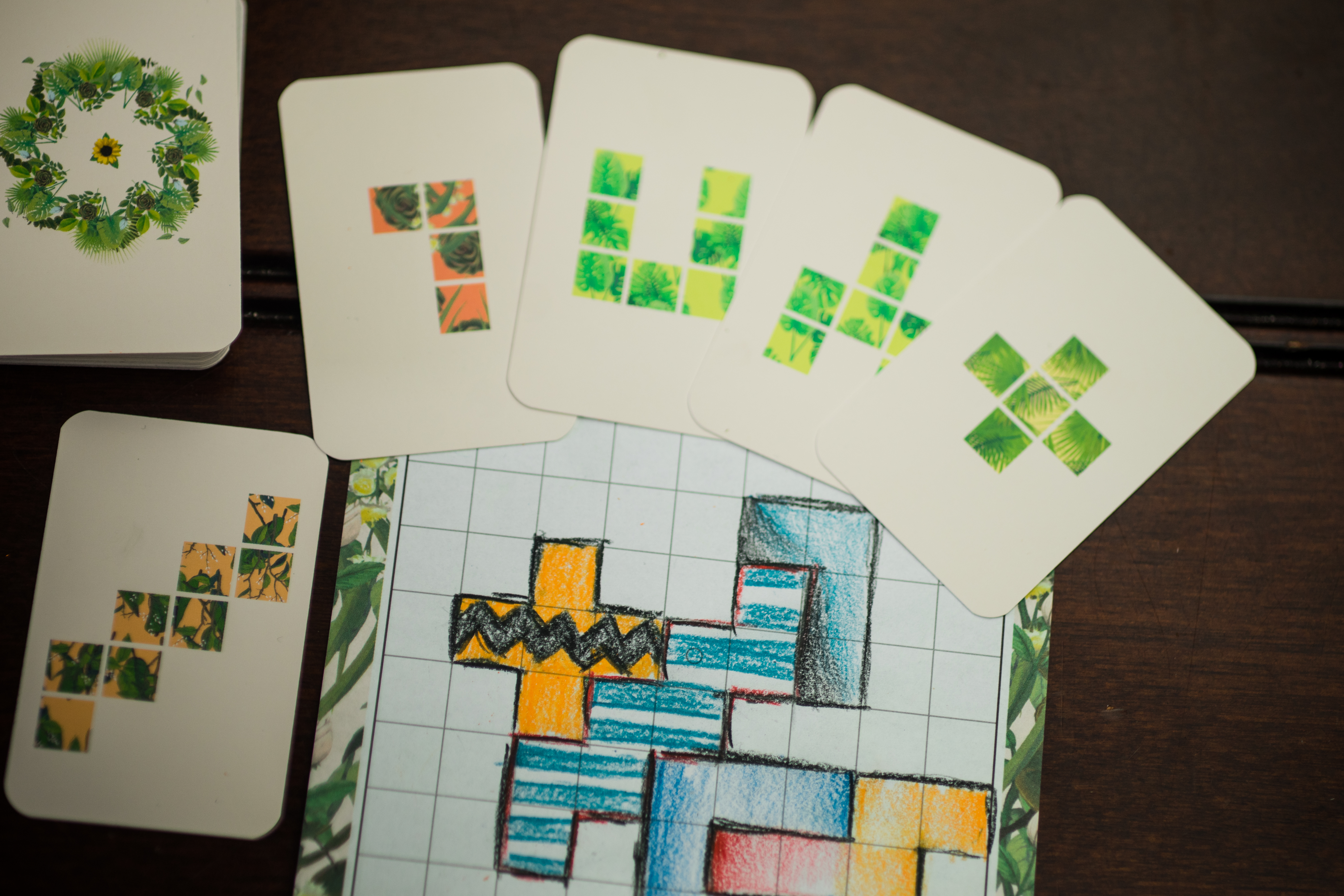 This is a flip-and-fill (or flip-and-write, or roll-and-write-but-with-cards) game in which everyone’s drawing polyominos on 9x9 grids. One player draws a card, and everyone draws the pictured shape wherever they choose on their grid, so long as it’s not overlapping with another shape or falling off the grid. Your goal is to fill as many squares as possible. But there’s one major twist: If you can’t draw a shape, you’re not done for. You’ll draw another card — your “second chance” — and if you can draw that shape on your sheet, you’re back in the game. It’s a simple premise, but that’s sort of the point. It’s dead simple to teach and fun to play — and even more fun to play with colored pencils.