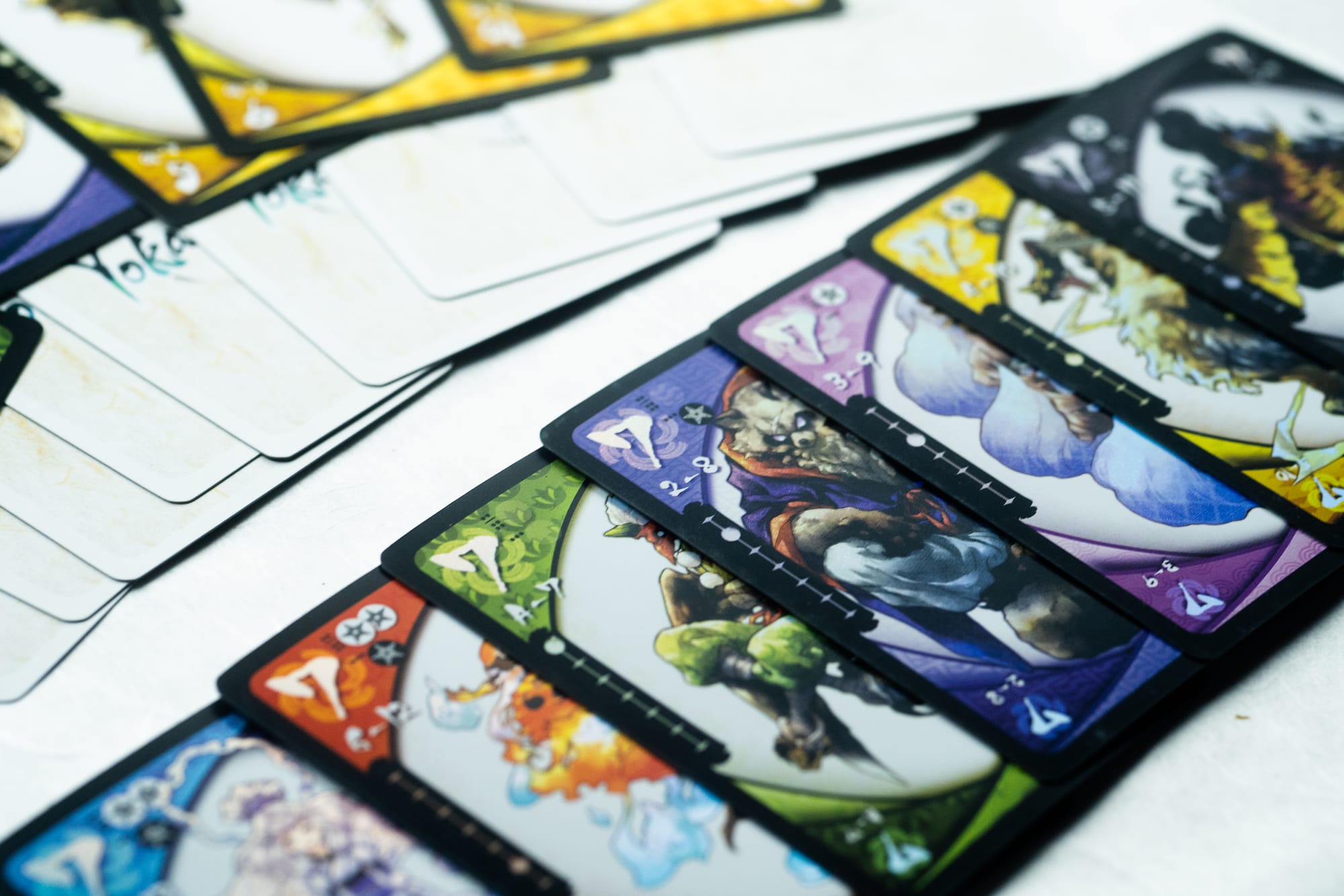 In Yokai Septet, there are a bunch of suits. How many? Seven. Each suit has a different progression of ranks, and there are (you guessed it!) seven cards in each suit. Each suit features a 7-rank card, which the game calls Boss Yokai. If you manage to collect four of those before your opponent, you’ll win, but only if you can do it before you win too many tricks. That’s the twist here — you can’t win seven tricks. You’ll lose if you do. Neat, right? Right!